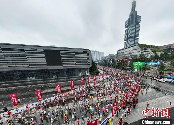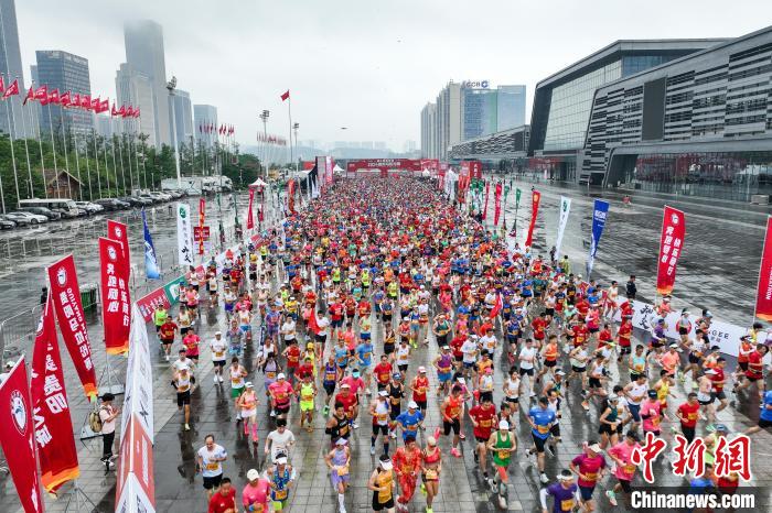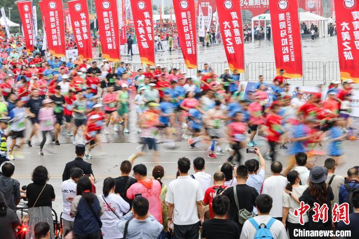 6月16日,2024贵阳马拉松赛在贵州省贵阳市观山湖区鸣枪开跑,赛事分为马拉松、半程马拉松、迷你马拉松,共吸引3.2万名选手参赛。图为参赛选手出发。 中新社记者瞿宏伦摄