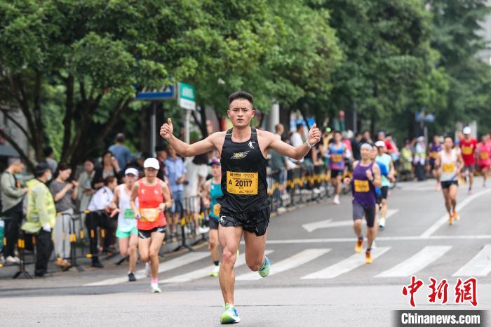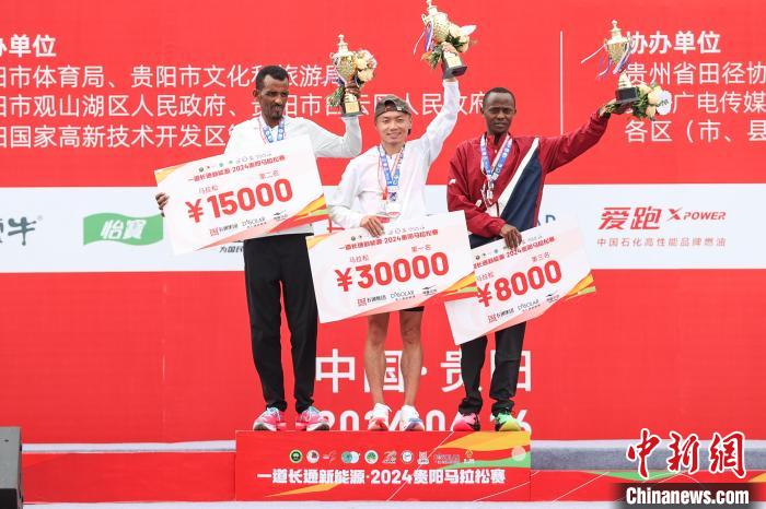 6月16日,2024贵阳马拉松赛在贵州省贵阳市观山湖区鸣枪开跑,赛事分为马拉松、半程马拉松、迷你马拉松,共吸引3.2万名选手参赛。在马拉松男子组比赛中,中国贵州选手岑万江以2小时20分33秒的成绩排名第一,埃塞俄比亚选手HEYITEBALUZAWUDE和肯尼亚选手GACHAGAMORRISMUNENE分别排名第二和第三。 中新社记者瞿宏伦摄
