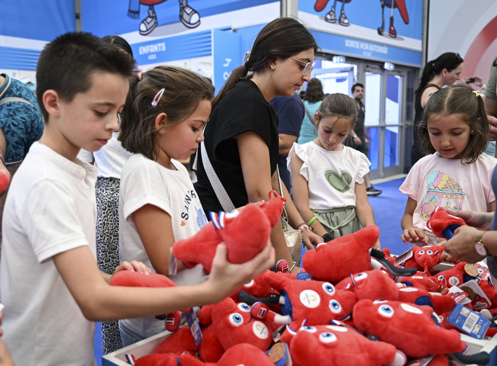 6月27日,小顾客们在选购巴黎奥运会吉祥物“弗里热”周边纪念品。新华社记者 贺长山 摄