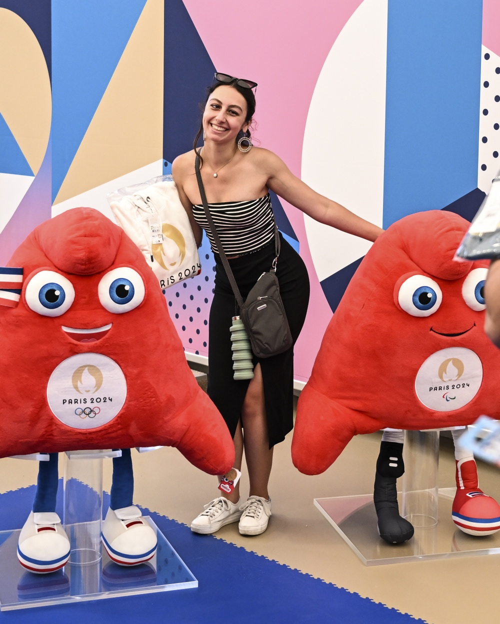 6月27日,顾客与巴黎奥运会吉祥物“弗里热”周边纪念品合影。新华社记者 贺长山 摄