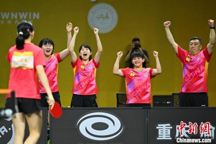 7月2日,在重庆市渝北体育馆举行的第28届亚洲青少年乒乓球锦标赛U15组女团决赛中,中国队3比2险胜中国香港队夺冠。图为中国队庆祝夺冠。 中新社记者何蓬磊摄