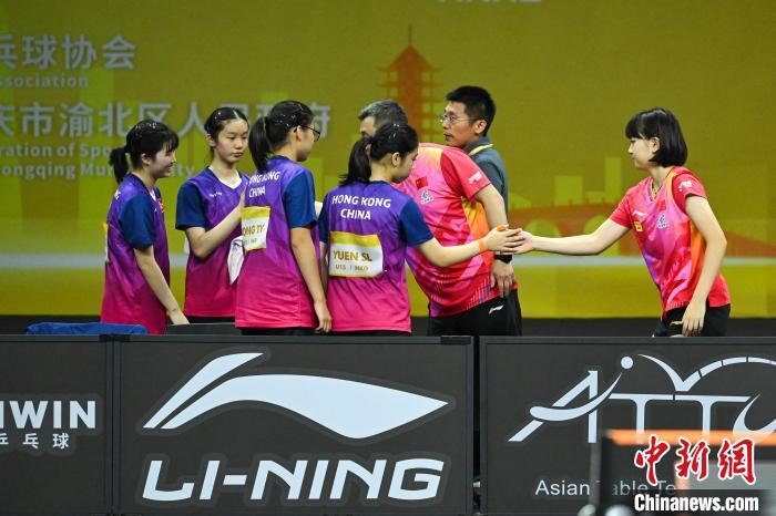 7月2日,在重庆市渝北体育馆举行的第28届亚洲青少年乒乓球锦标赛U15组女团决赛中,中国队3比2险胜中国香港队夺冠。图为赛后中国队选手与中国香港队选手握手致意。 中新社记者何蓬磊摄