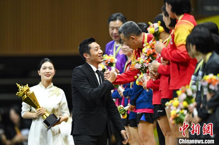 7月2日,在重庆市渝北体育馆举行的第28届亚洲青少年乒乓球锦标赛U15组女团决赛中,中国队3比2险胜中国香港队夺冠。图为亚洲乒乓球联盟副主席许昕(左二)与夺冠的中国队选手及教练员握手,并颁发冠军奖杯。 中新社记者何蓬磊摄