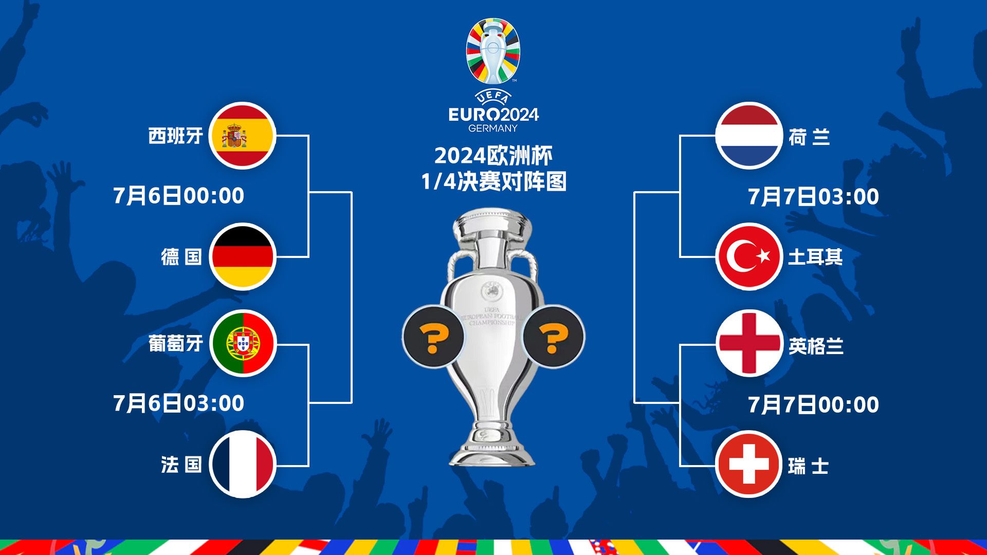 欧洲杯1/8决赛昨天结束,八强随之出炉,四分之一决赛的悬念将进一步升级,一起来看具体对阵。