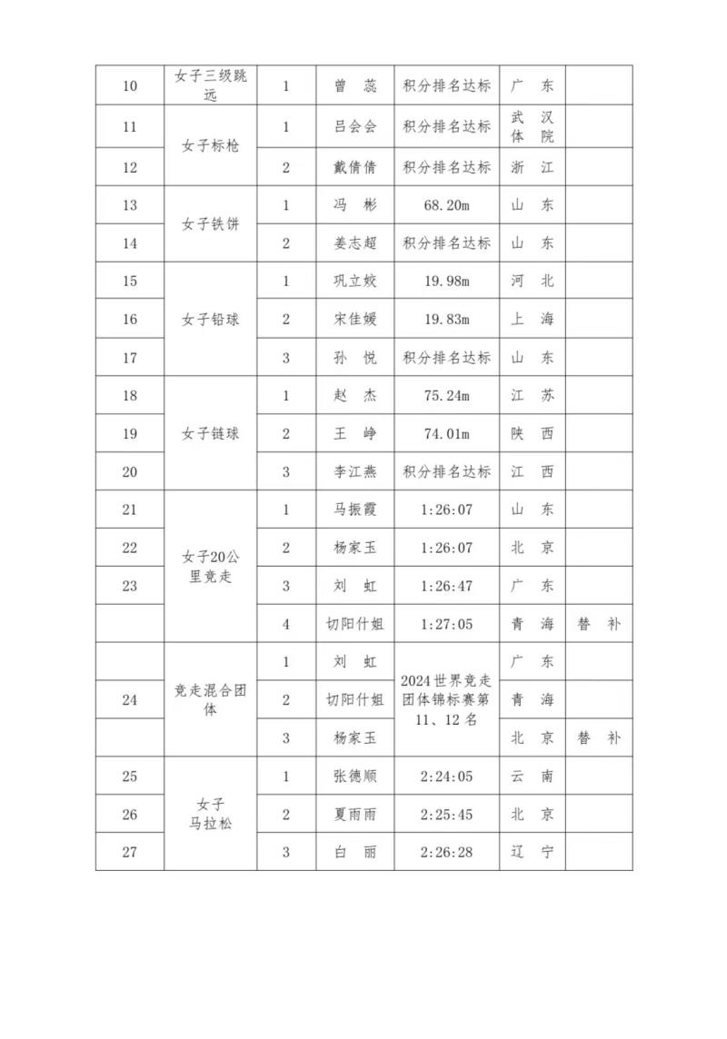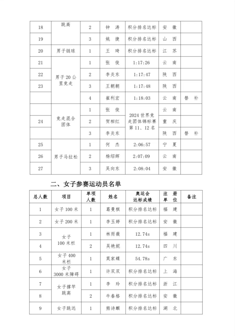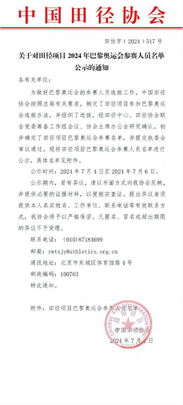 新京报讯7月4日,中国田径协会官网发布关于对田径项目2024年巴黎奥运会参赛人员名单公示的通知,全文如下:
