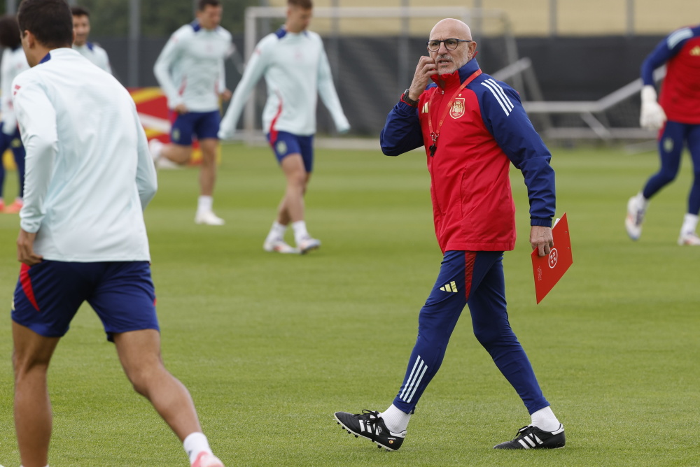7月4日,西班牙队主帅德拉富恩特带队训练。新华社/欧新