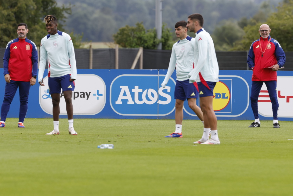 7月4日,西班牙队主帅德拉富恩特与球员托雷斯、佩德里和威廉姆斯(右至左)在训练中。新华社/欧新
