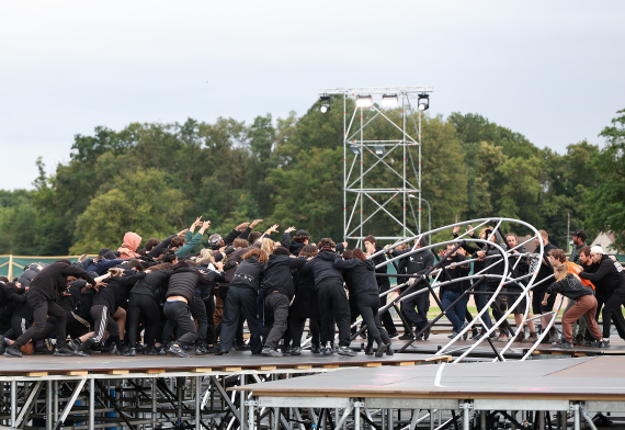 记者在排练现场看到的仅仅是整个演出的其中一部分,由于服装和布景暂时保密,所有演员都身穿黑衣。几分钟的时间里,表演者们展示了已经排练好的舞蹈动作以及杂技表演,这一部分表演均在象征着“奥运遗迹”的圆形钢架结构上进行。