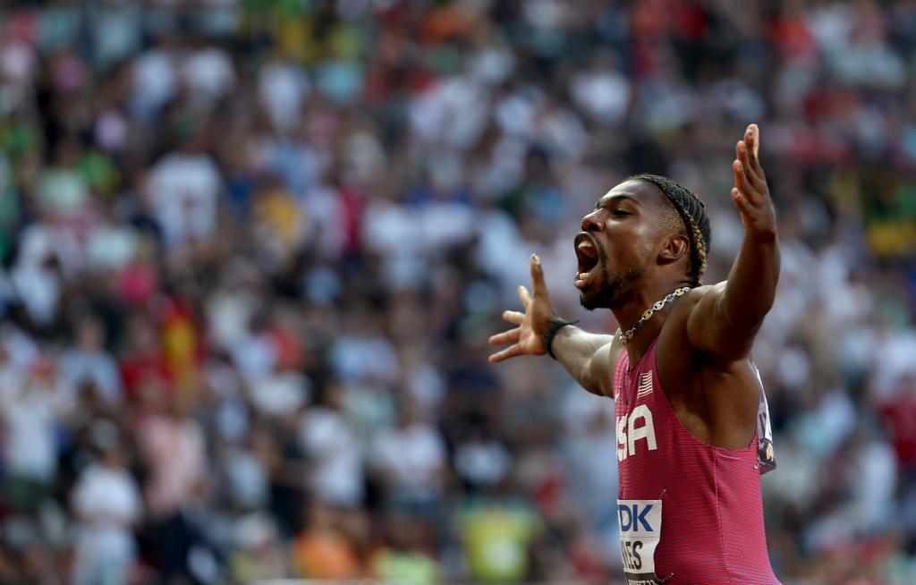 2023年8月20日,美国选手诺亚·莱尔斯在2023世界田径锦标赛男子100米决赛后庆祝。新华社记者李颖摄