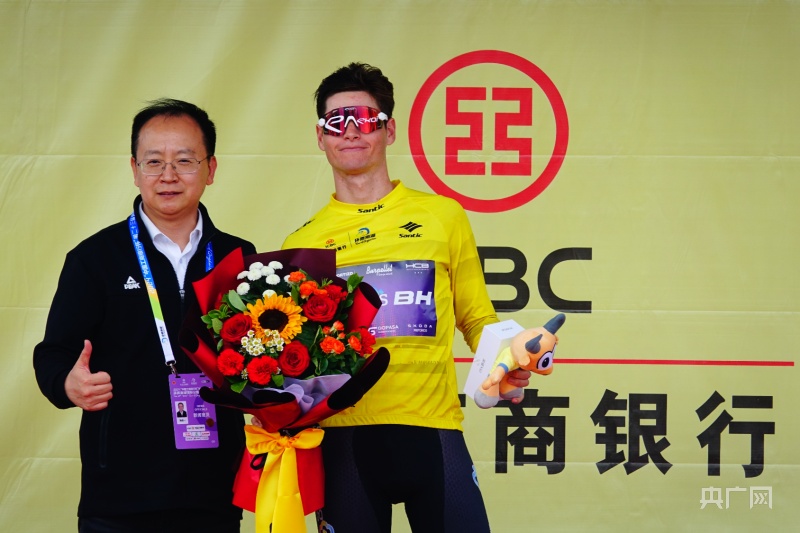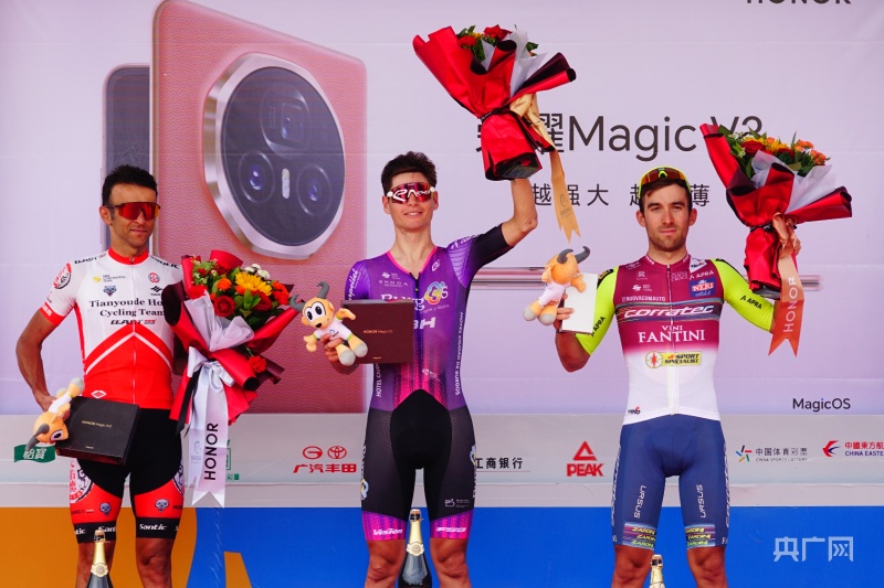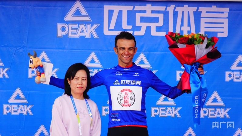 黄衫获得者——西班牙布尔戈斯车队的32号埃里克-法贡德斯与颁奖嘉宾合影(央广网记者张海东摄)