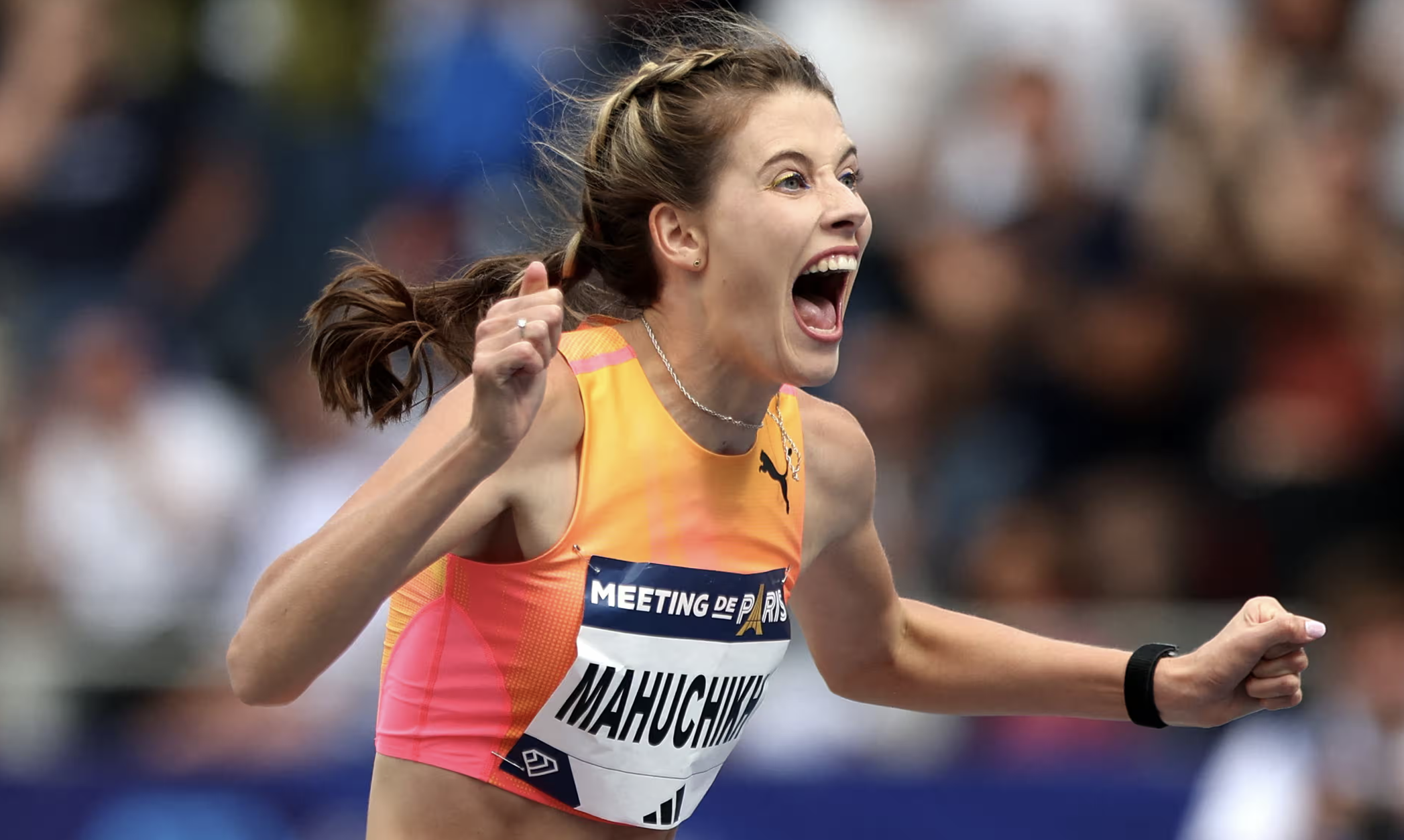 巴黎的夏莱蒂体育场给了马胡奇赫一个“天时地利人和”的环境——她和最大的竞争对手、今年室内世锦赛赢下金牌的澳大利亚名将尼古拉·麦克德莫特都用两跳完成了2米01的尝试,但到2米03时,麦克德莫特三跳都没有过杆,而马胡奇赫仅用两次就挑战成功。