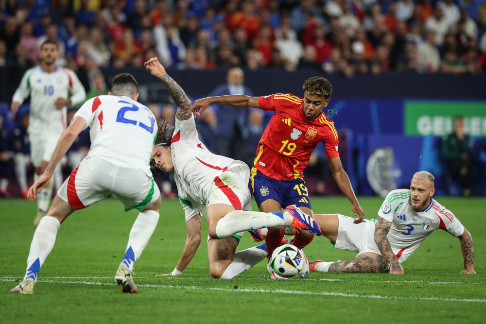 6月20日,西班牙队球员亚马尔(右二)在比赛中带球突破。当日,在德国盖尔森基兴进行的2024欧洲足球锦标赛B组次轮比赛中,西班牙队1:0战胜意大利队。新华社记者 潘昱龙 摄