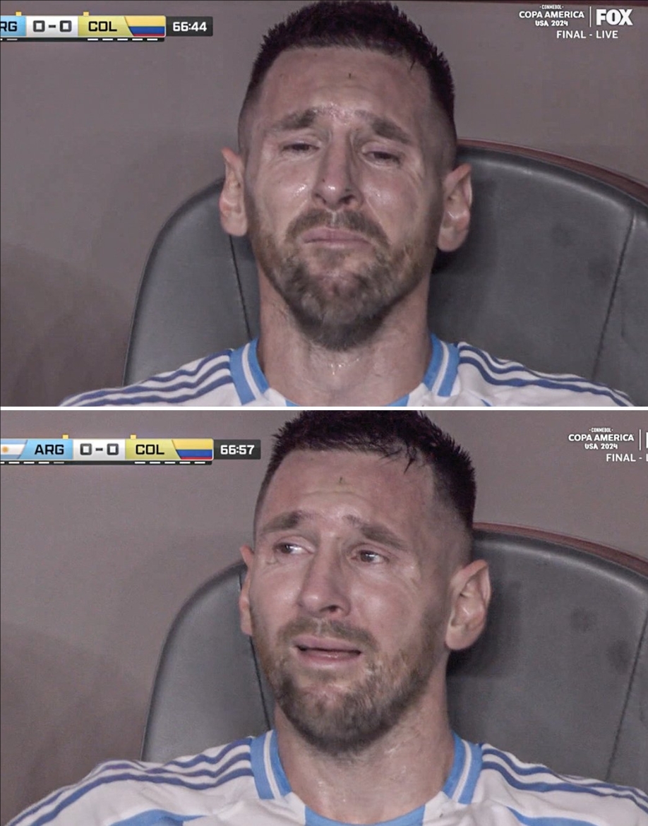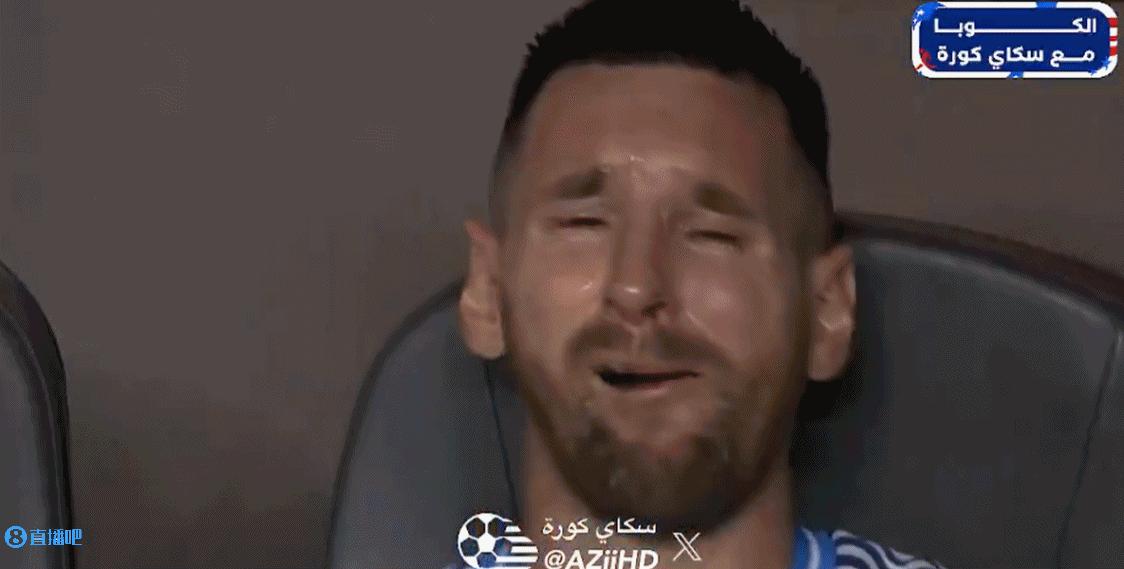 下场后的梅西,坐在替补席上捂脸痛哭,一直哭到69分钟仍在哭泣。
