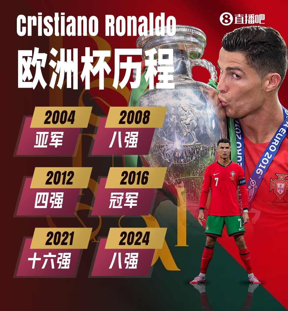 自此,39岁的C罗结束了自己第五次的欧洲杯生涯,获得1次冠军、1次亚军、1次四强、2次八强,一次十六强。