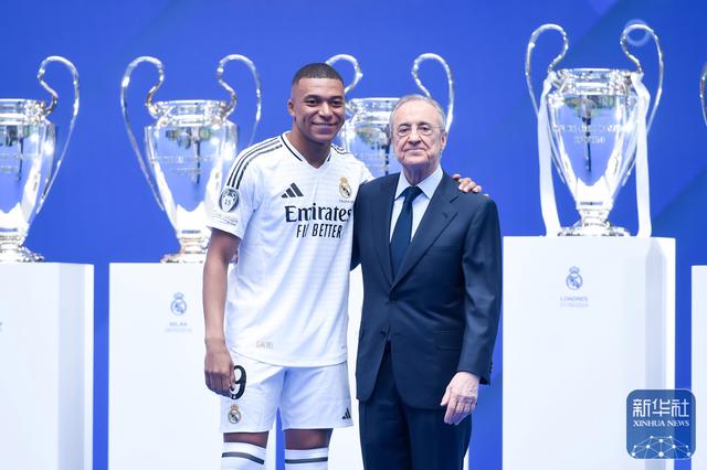 ↑皇马主席弗洛伦蒂诺(右)与姆巴佩在亮相仪式上合影。