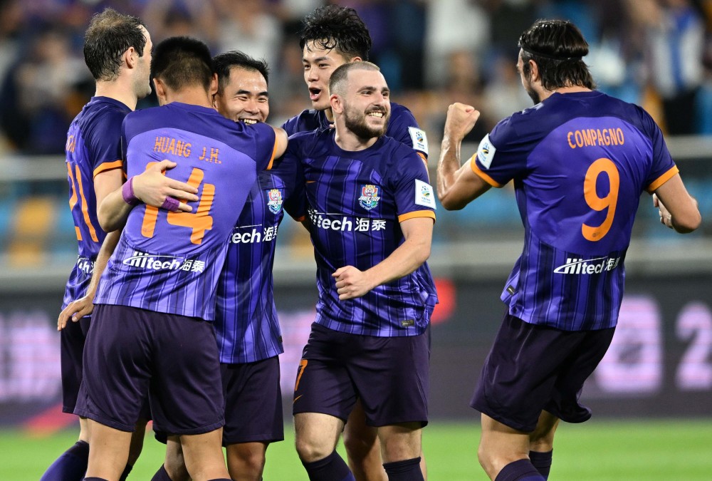 7月17日,天津津门虎队球员孔帕尼奥(左三)在进球后庆祝。新华社记者 赵子硕 摄