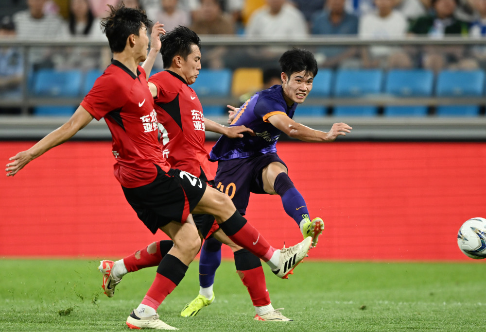 7月17日,天津津门虎队球员石炎(右)在比赛中射门。新华社记者 赵子硕 摄