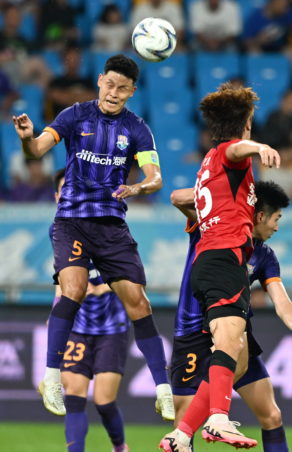 7月17日,天津津门虎队球员于洋(左)在比赛中争顶。新华社记者 赵子硕 摄