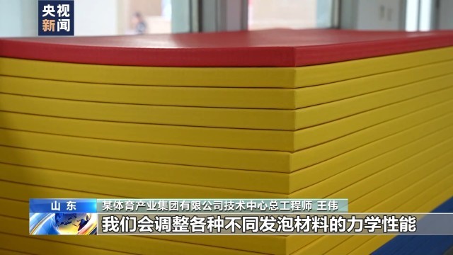 某体育产业集团有限公司技术中心总工程师王伟:我手里拿的是摔跤垫,这一款是柔道垫,根据项目的不同,我们会调整各种不同发泡材料的力学性能。比如发泡的倍率、密度、硬度以及孔径的大小、压缩的弹性性能。首次推出了智能芯片的技术,可以实时采集运动员在运动过程中的力量、速度以及区域信息,以便于给运动员一个训练指导。我们在皮革的涂层上加了一层纳米抗菌涂层膜,它能保证当垫子表面具有微生物的时候,不容易发生积聚和繁衍。这项技术是我们首次应用到柔道垫的产品上。