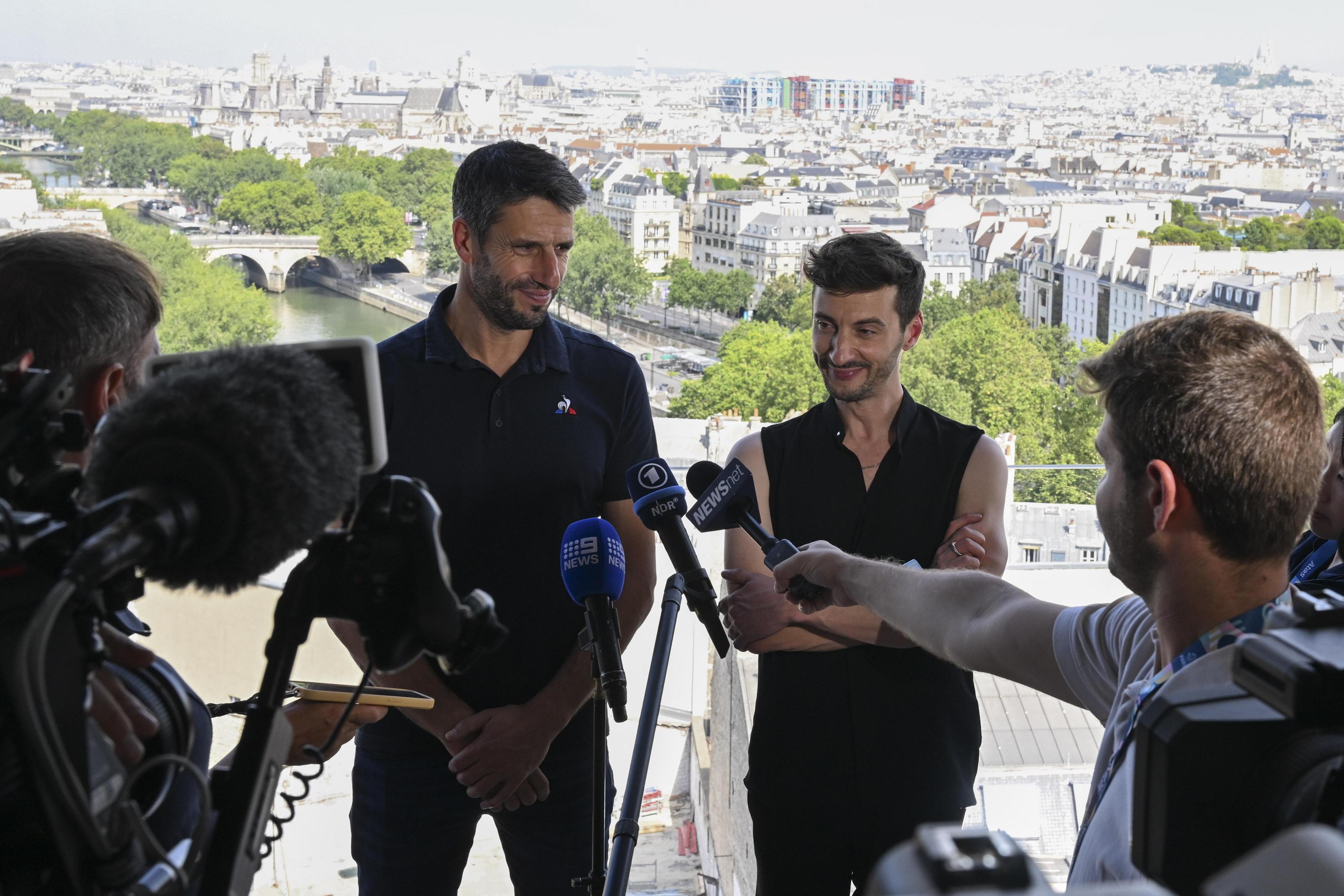 △巴黎奥运会开闭幕式艺术总监托马斯·乔利(右)接受媒体采访