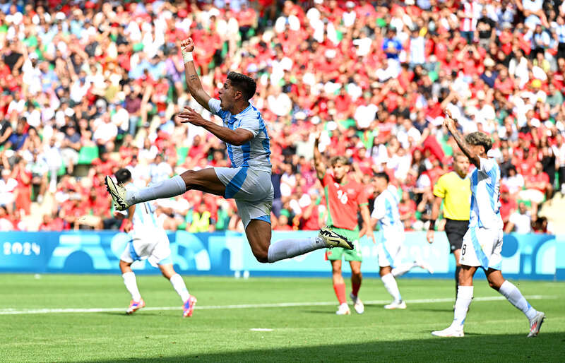 当地时间7月24日下午,阿根廷国奥队2:2战平摩洛哥队。图为阿根廷队“将门之后”西蒙尼庆祝进球。视觉中国供图