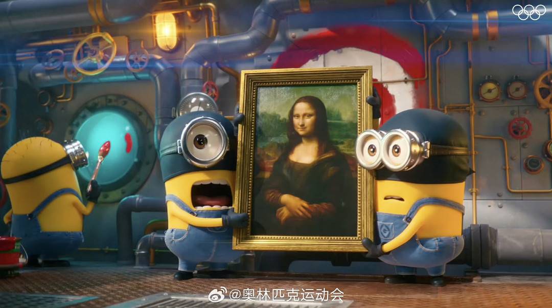 1911年,《蒙娜丽莎》在卢浮宫被盗。一个名叫文森佐·佩鲁吉亚的意大利工匠,利用自己在卢浮宫工作的机会,趁人不备将画作盗走。由于当时卢浮宫的安保措施并不严密,加之蒙娜丽莎当时并不像现在这样享有盛名,失窃初期并未引起太大关注。然而,两年后,佩鲁吉亚试图将画作卖给佛罗伦萨的一位艺术品交易商,但由于其行为可疑,交易商报警,佩鲁吉亚被捕,蒙娜丽莎得以安全回收。但在这次开幕式上,《蒙娜丽莎》竟是被小黄人偷走了,而《神偷奶爸》里的小黄人,它们的语言体系正是由法语改编而成。在《神偷奶爸3》上映期间,法国旅游发展署甚至与照明娱乐合作,推出了一系列以小黄人为形象大使的宣传视频,向全世界展示了法国各地的风光与魅力。