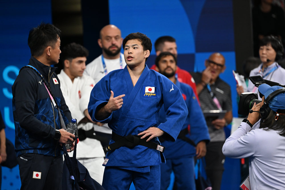 7月27日,日本选手永山龙树(前中)在男子60公斤级比赛后。新华社记者 武巍 摄