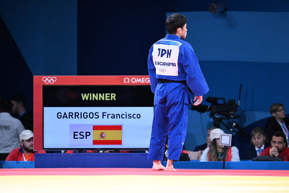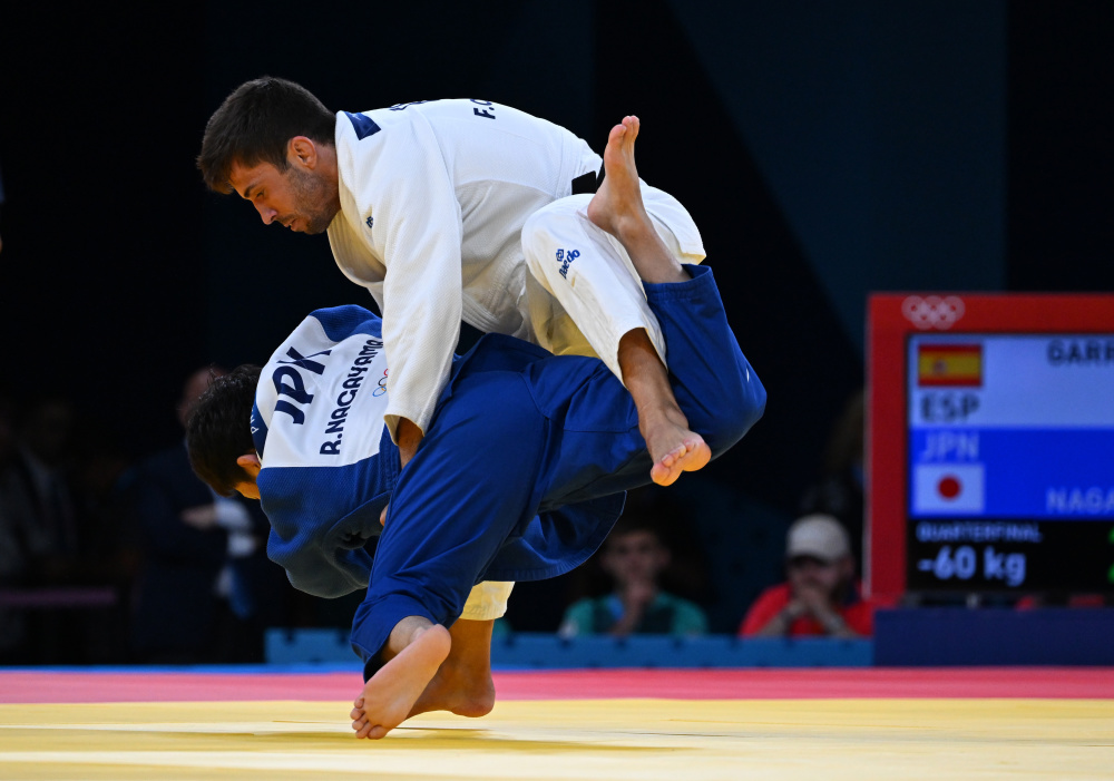 7月27日,日本选手永山龙树(右)与西班牙选手弗朗西斯科·加里戈斯在男子60公斤级比赛中。新华社记者 武巍 摄