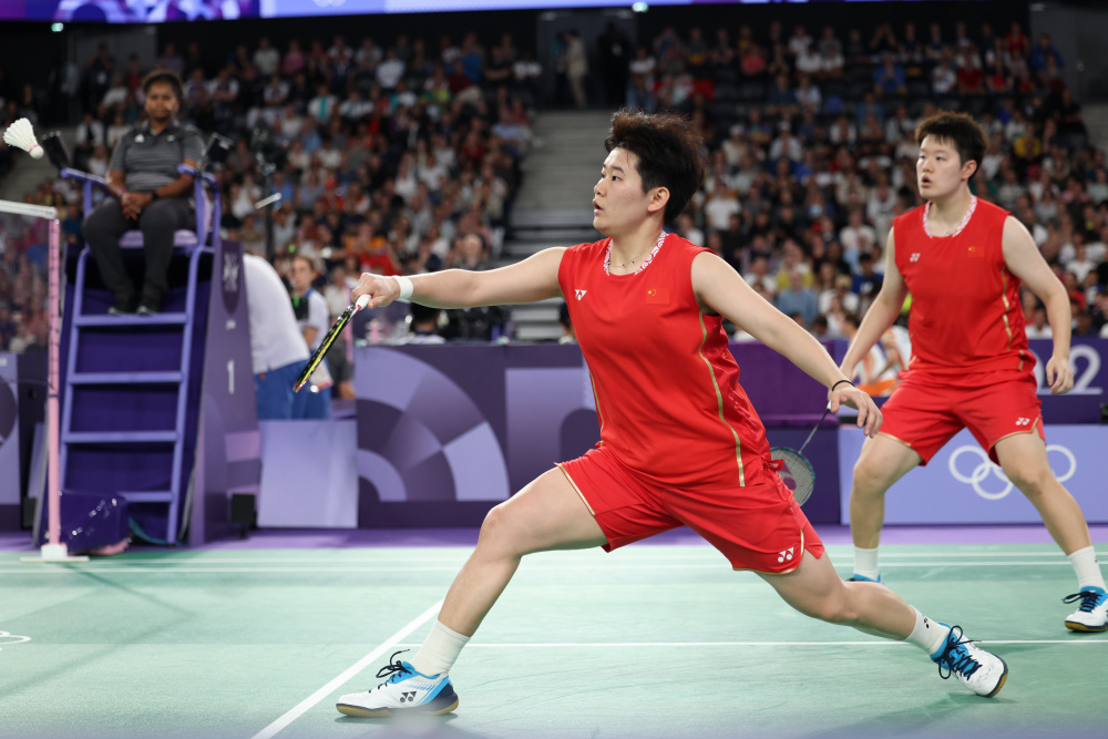 7月27日,中国组合刘圣书/谭宁(左)在比赛中。新华社记者 陈斌 摄