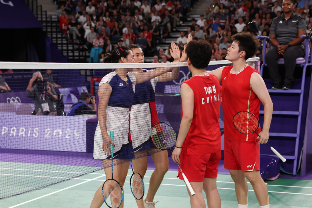 7月27日,中国组合刘圣书(右一)/谭宁(右二)赛后与美国组合许忻霏/许怡霏致意。新华社记者 陈斌 摄