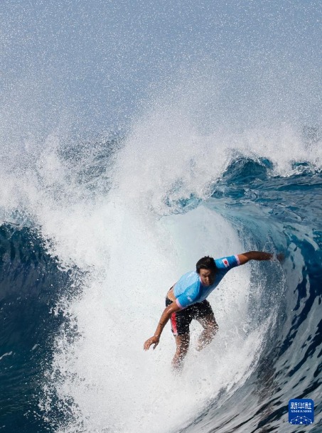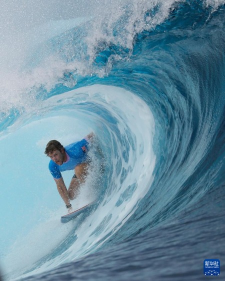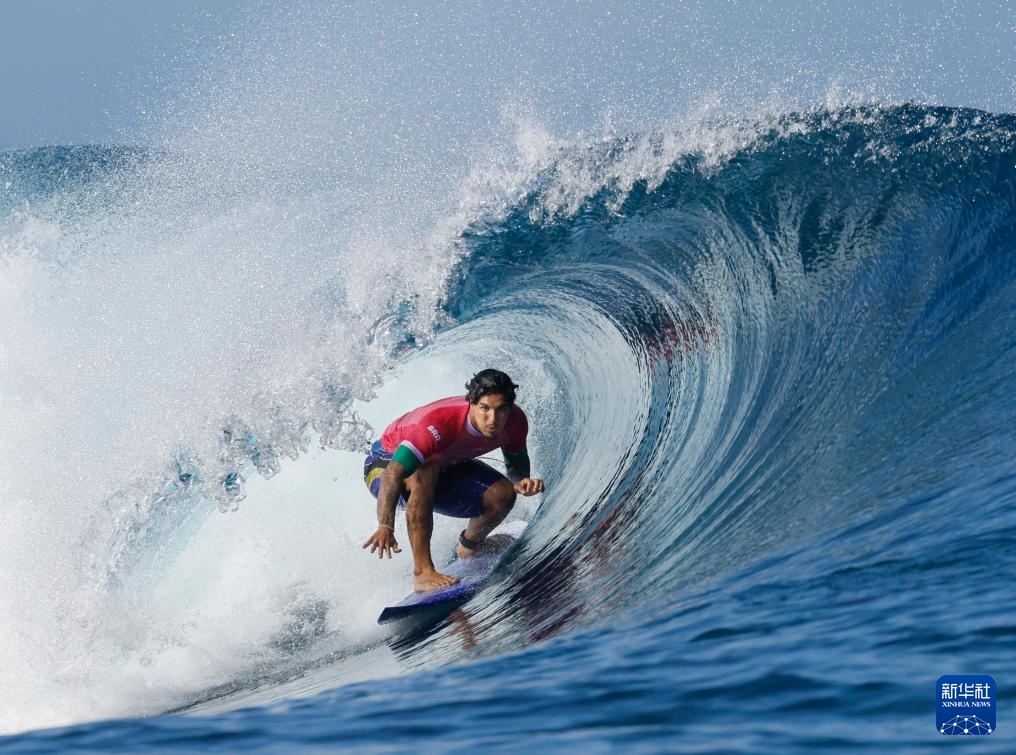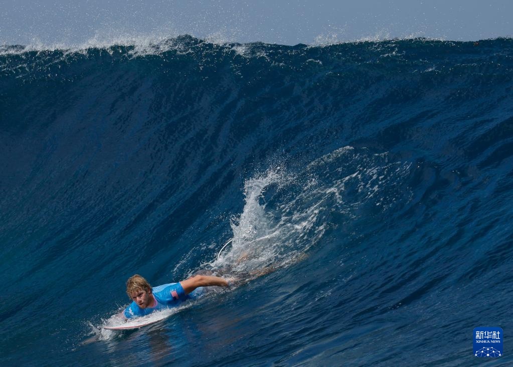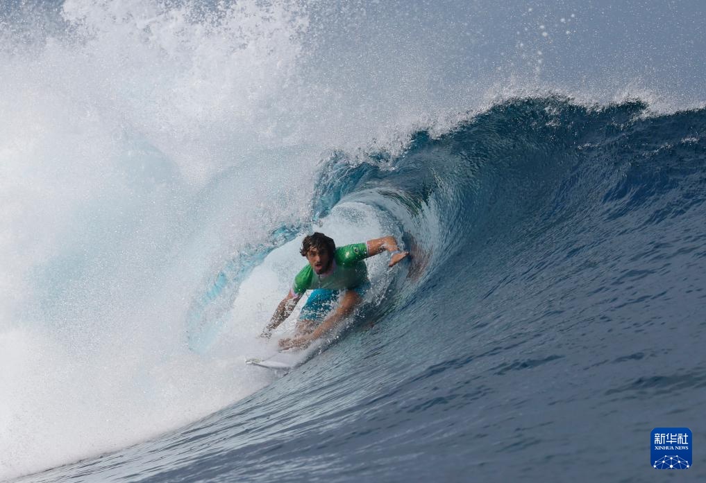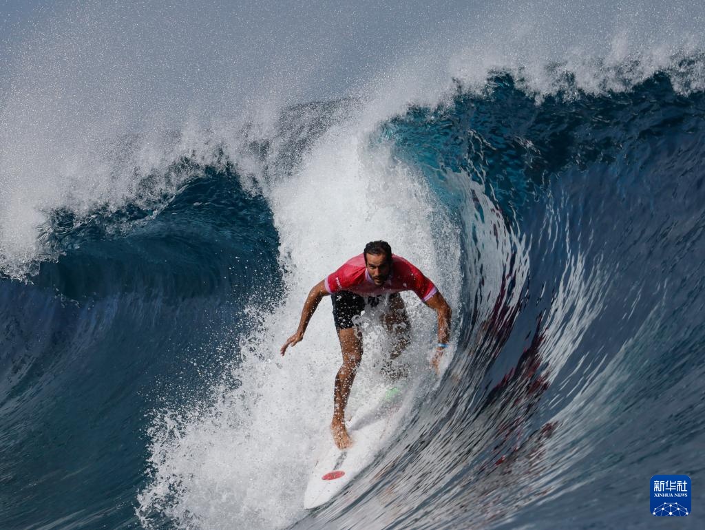 7月27日,巴黎奥运会冲浪男子组预赛第一轮比赛在法属波利尼西亚群岛塔希提的提阿胡普举行。