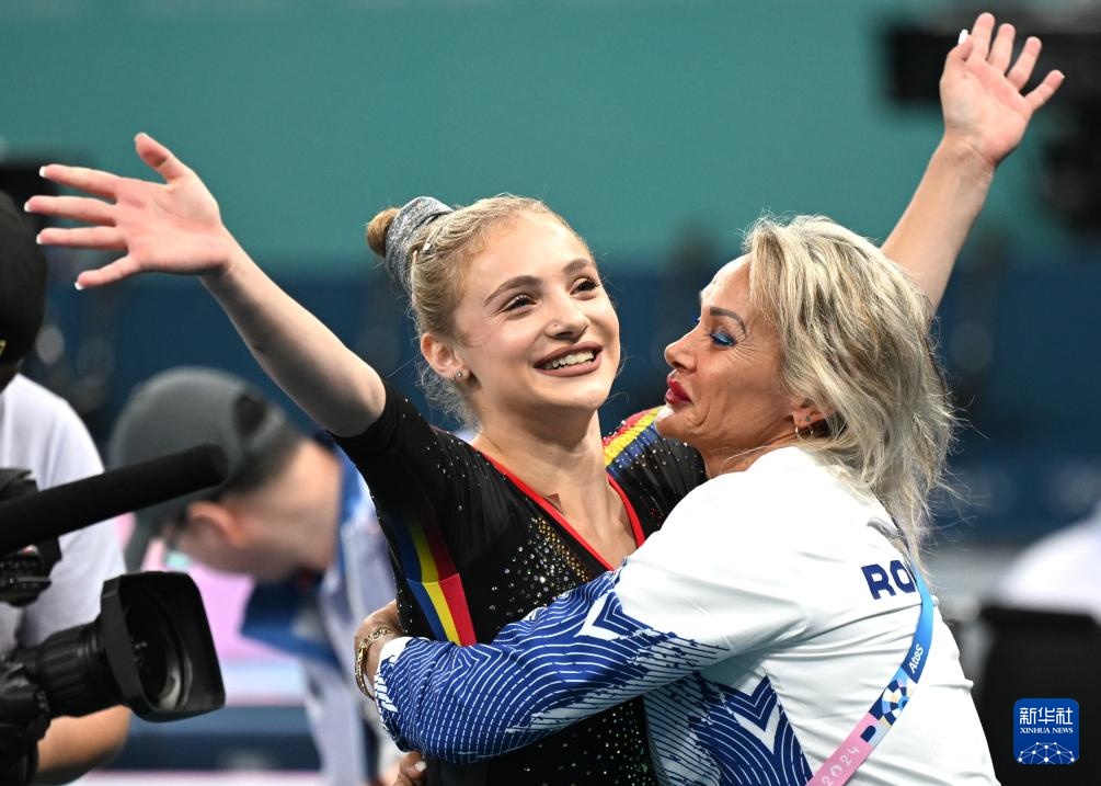 7月28日,罗马尼亚选手萨布丽娜·马内卡-沃伊内亚在平衡木比赛后与教练拥抱庆祝。新华社记者 程敏 摄