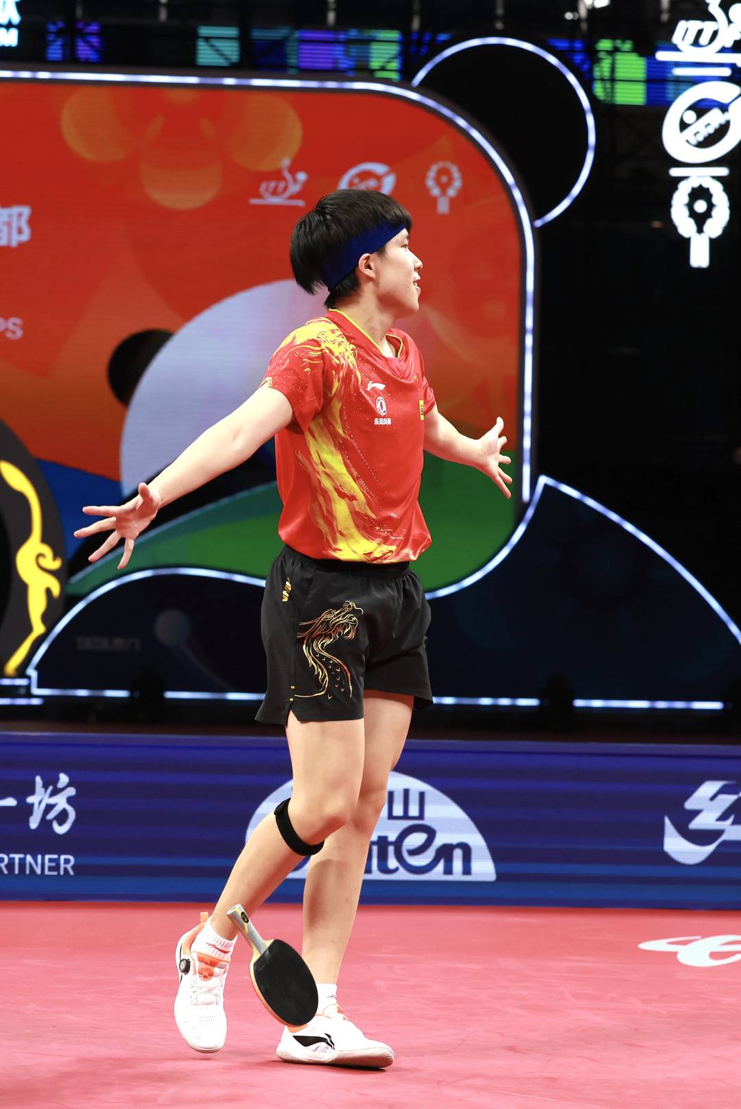 王楚钦在成都世乒赛扔掉球拍庆祝胜利。陈羽啸摄