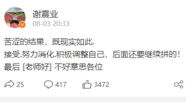 赛后,谢震业发博称:苦涩的结果,既现实如此。接受努力消化,积极调整自己,后面还要继续拼的!最好,不好意思各位!