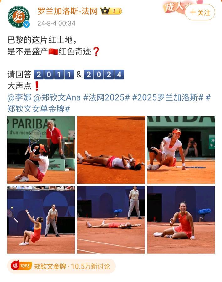 随后,罗兰•加洛斯法国网球公开赛官方微博发文祝贺郑钦文:巴黎的这片红土地,是不是盛产红色奇迹?请回答:2011&2024。该微博除了@郑钦文,还@了李娜。