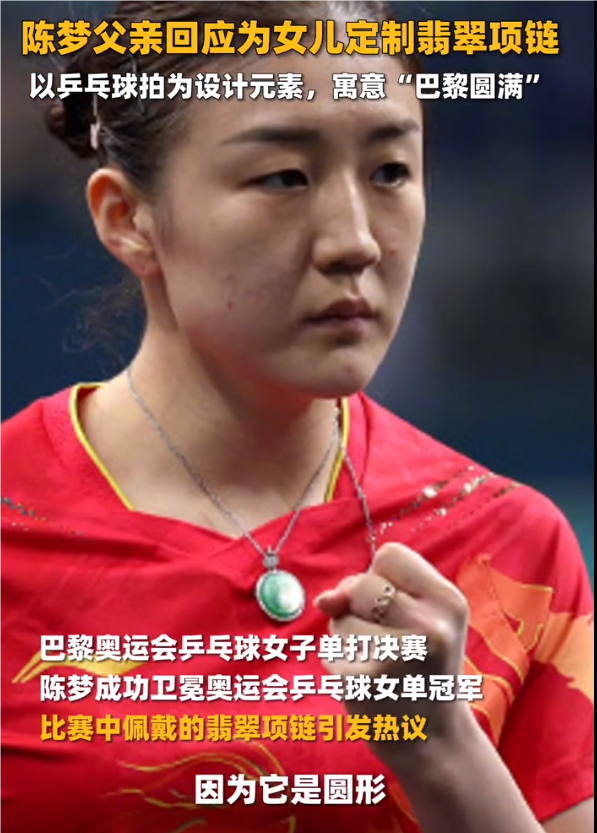 据陈梦的父亲陈樑介绍,翡翠平安牌是他专门为女儿定制的,和耳钉是一套,上边的扣头是乒乓球拍的形状,寓意“巴黎圆满”。有专业的翡翠商表示,这一套翡翠费用和镶嵌费用加起来并不贵,大约两三万块钱。