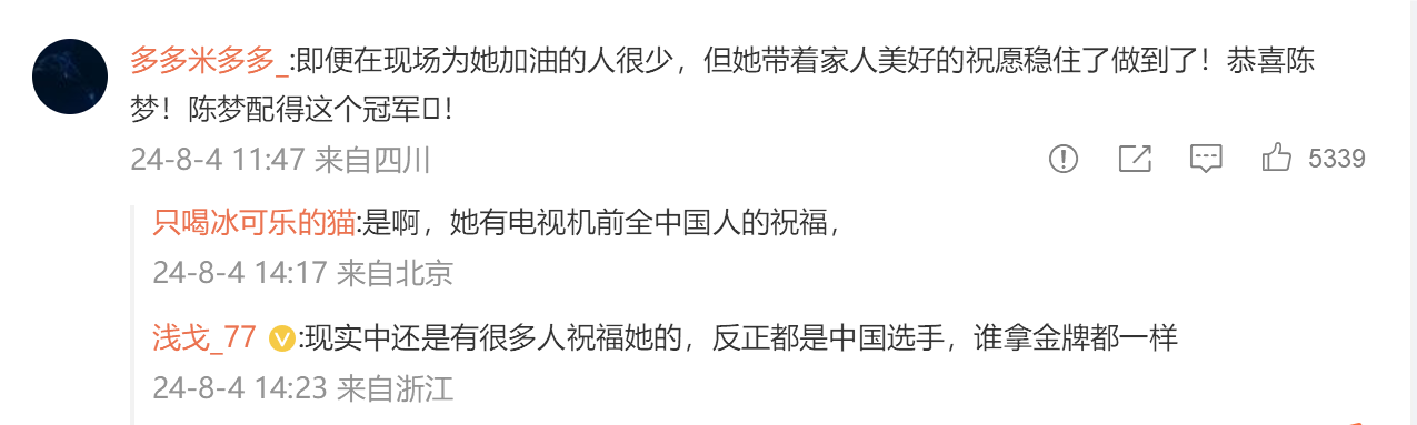 对此,有不少网友评论:“人家爸妈给她的祝福”“她带着家人美好的祝愿稳住了做到了!恭喜陈梦!陈梦配得这个冠军!”“反正都是中国选手,谁拿金牌都一样”。