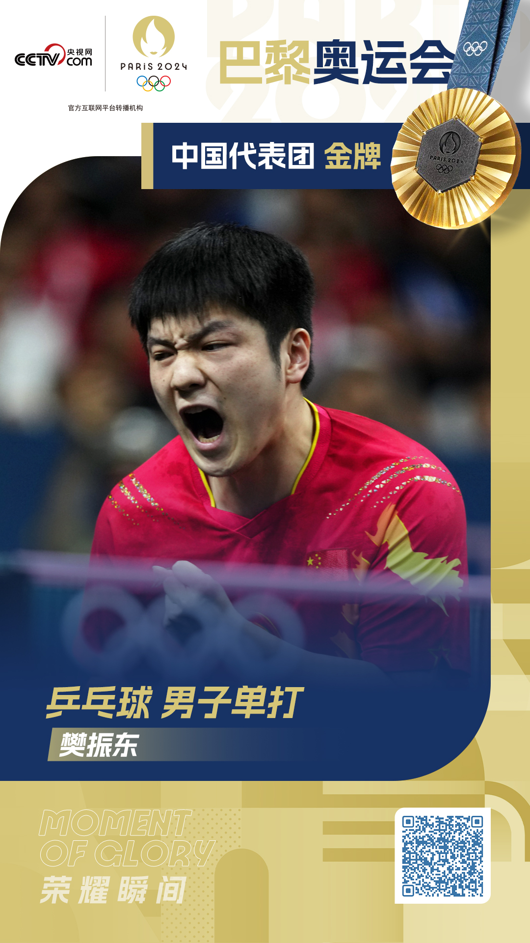 央视网消息:北京时间8月4日,2024年巴黎奥运会乒乓球男单金牌赛,中国选手樊振东4-1力克瑞典“黑马”莫雷高德,夺得奥运会男单金牌实现大满贯!这也是中国代表团在巴黎奥运会上夺得的第17枚金牌!