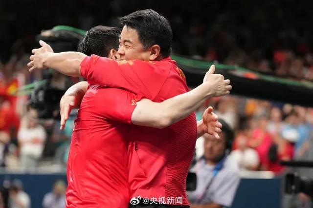樊振东夺冠瞬间,教练王皓振臂欢呼、紧紧拥抱、亲吻额头、高高举起,上演“组合拳”庆祝动作。付出终有收获,祝贺樊振东,祝贺王皓!