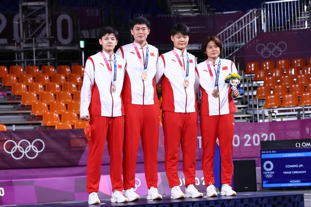 2021年7月28日,中国队在东京奥运会三人篮球女子组颁奖仪式上。新华社记者兰红光摄