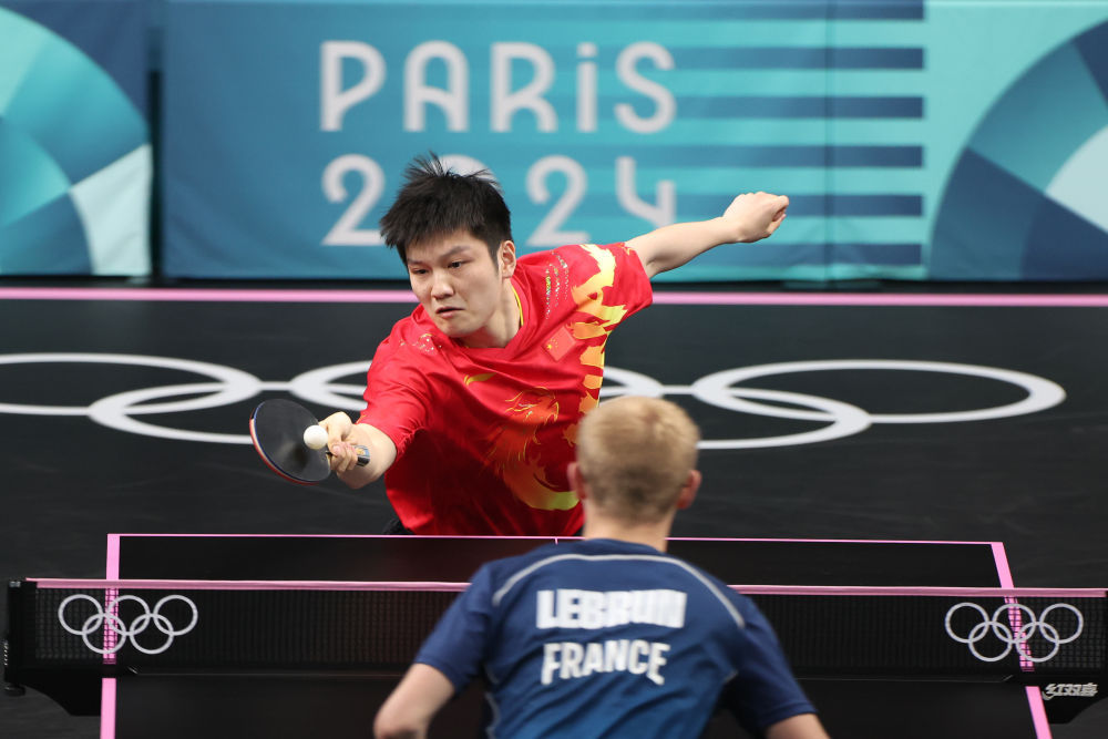 8月2日,樊振东(上)在比赛中。当日,在巴黎奥运会乒乓球男单半决赛中,中国选手樊振东4比0战胜法国选手菲利克斯·勒布伦,晋级决赛。新华社记者刘续摄