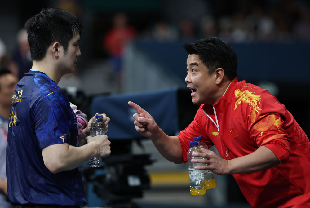 8月1日,中国队教练王皓(右)指导樊振东。当日,在巴黎奥运会乒乓球男单四分之一决赛中,中国选手樊振东4比3战胜日本选手张本智和,晋级四强。新华社记者王东震摄