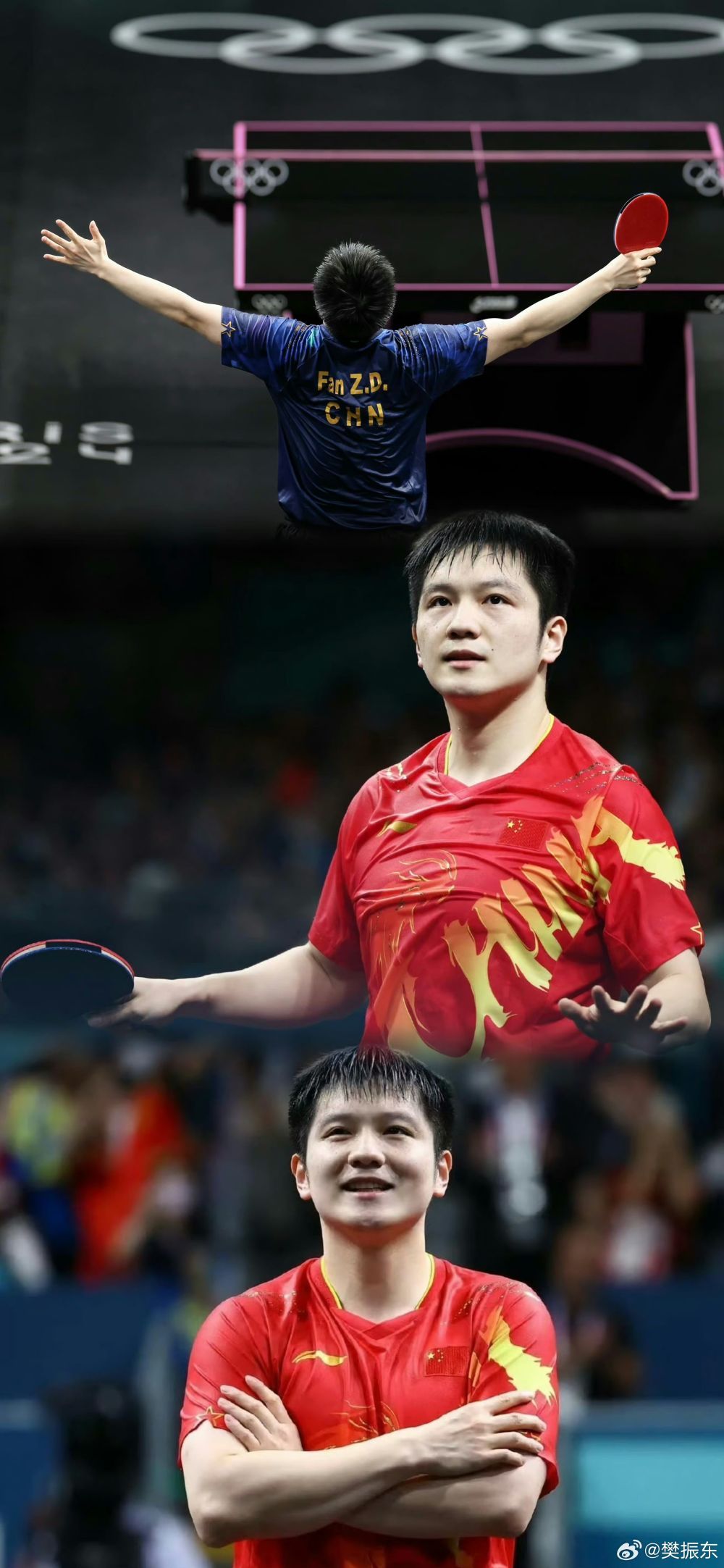 四分之一决赛逆转张本智和后,樊振东张开双臂,做出了贝林厄姆的庆祝动作。