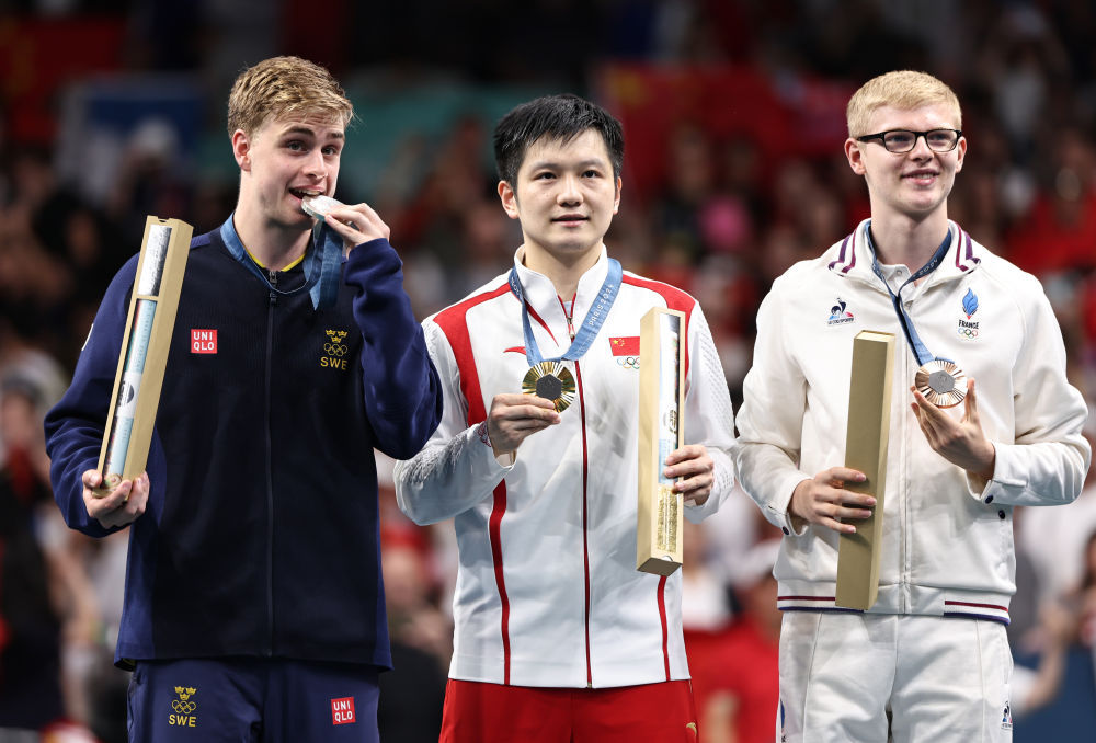 8月4日,冠军中国选手樊振东(中)、亚军瑞典选手莫雷高德(左)、季军法国选手菲利克斯·勒布伦在颁奖仪式上。当日,在巴黎奥运会乒乓球男单决赛中,中国选手樊振东4比1战胜瑞典选手莫雷高德,夺得金牌。新华社记者王东震摄
