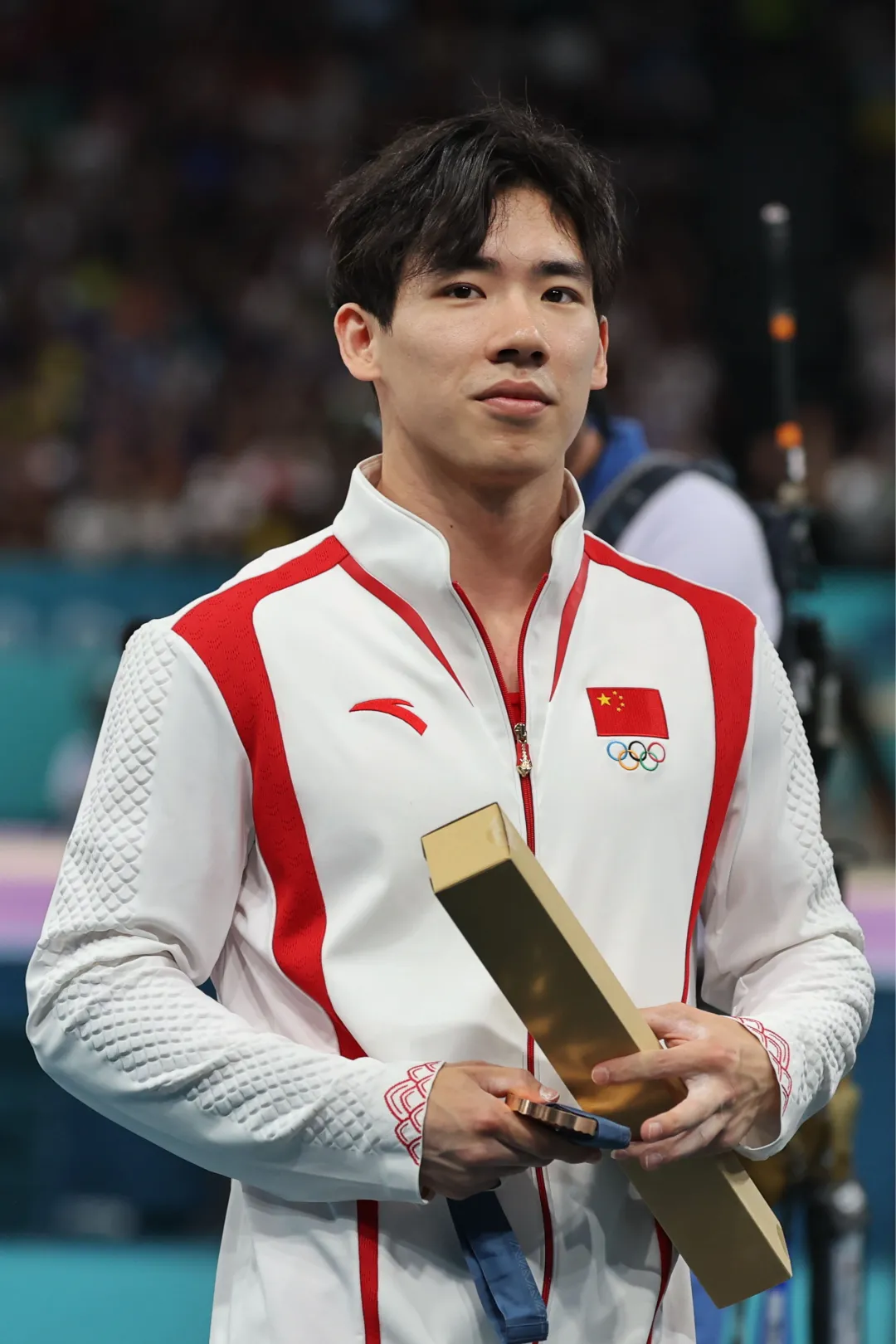 张博恒领取奖牌后,将获得的铜牌取下拿在手中。比赛中,张博恒在最后落地时失误,与金牌失之交臂。工人日报客户端 特派记者杨登峰摄