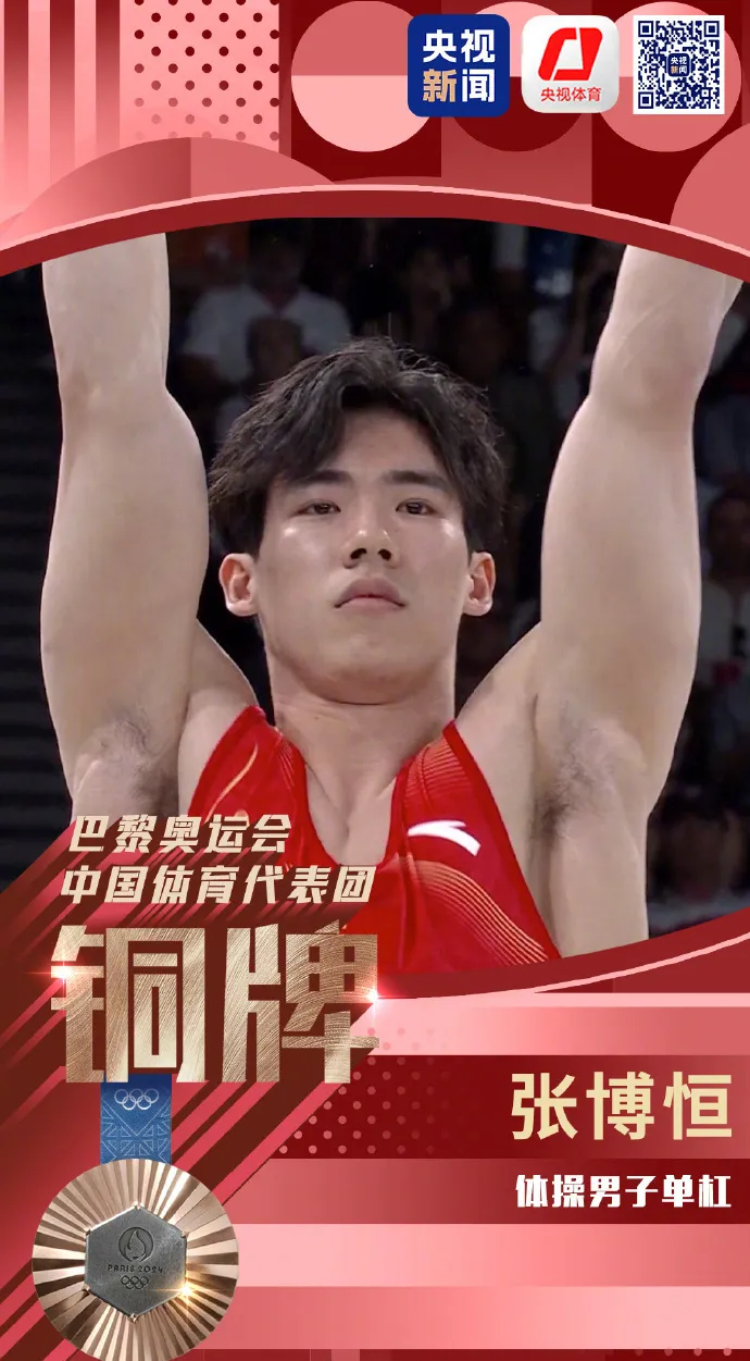 当地时间8月5日在巴黎奥运会体操男子单杠决赛中,中国选手张博恒收获铜牌,本届奥运会张博恒累计得到2银1铜。