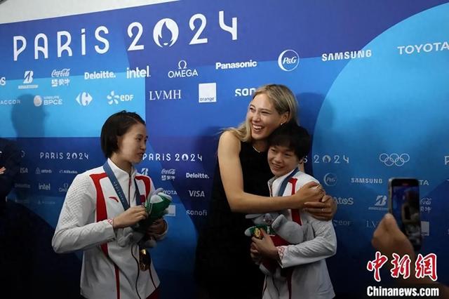 当地时间7月31日,在巴黎奥运会跳水女子双人10米台项目中,中国队组合陈芋汐/全红婵获得冠军。谷爱凌(中)在赛后化身粉丝与陈芋汐(左)、全红婵合影。中新社记者 富田 摄