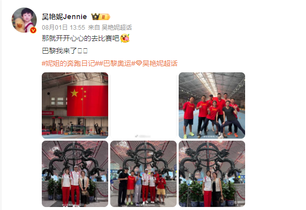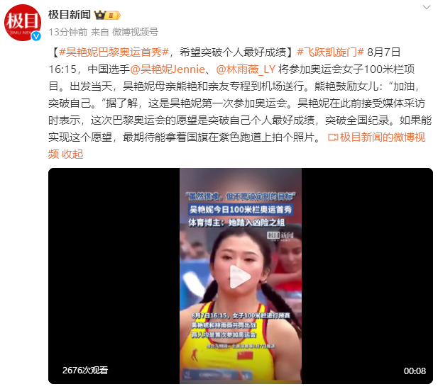 8月1日出发当天,吴艳妮母亲熊艳和亲友专程到机场送行。熊艳鼓励女儿:“加油,突破自己。”据了解,这是吴艳妮第一次参加奥运会。吴艳妮在此前接受媒体采访时表示,这次巴黎奥运会的愿望是突破自己个人最好成绩,突破全国纪录。如果能实现这个愿望,最期待能拿着国旗在紫色跑道上拍个照片。
