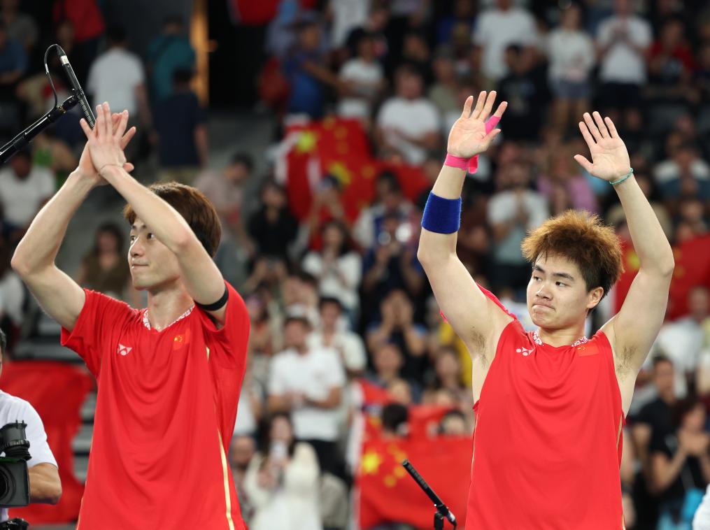 8月2日,中国组合梁伟铿(右)/王昶在比赛后向观众致意。新华社记者 贾浩成 摄
