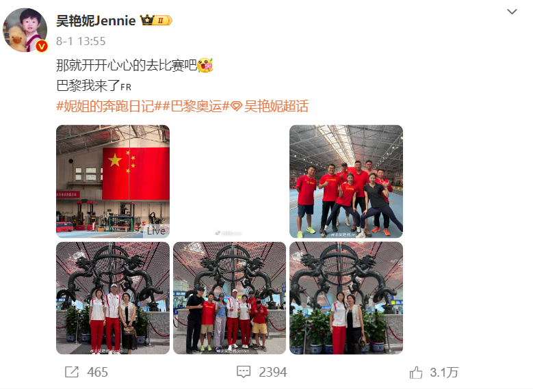 吴艳妮在此前接受媒体采访时表示,这次巴黎奥运会的愿望是突破自己个人最好成绩,突破全国纪录。如果能实现这个愿望,最期待能拿着国旗在紫色跑道上拍个照片。
